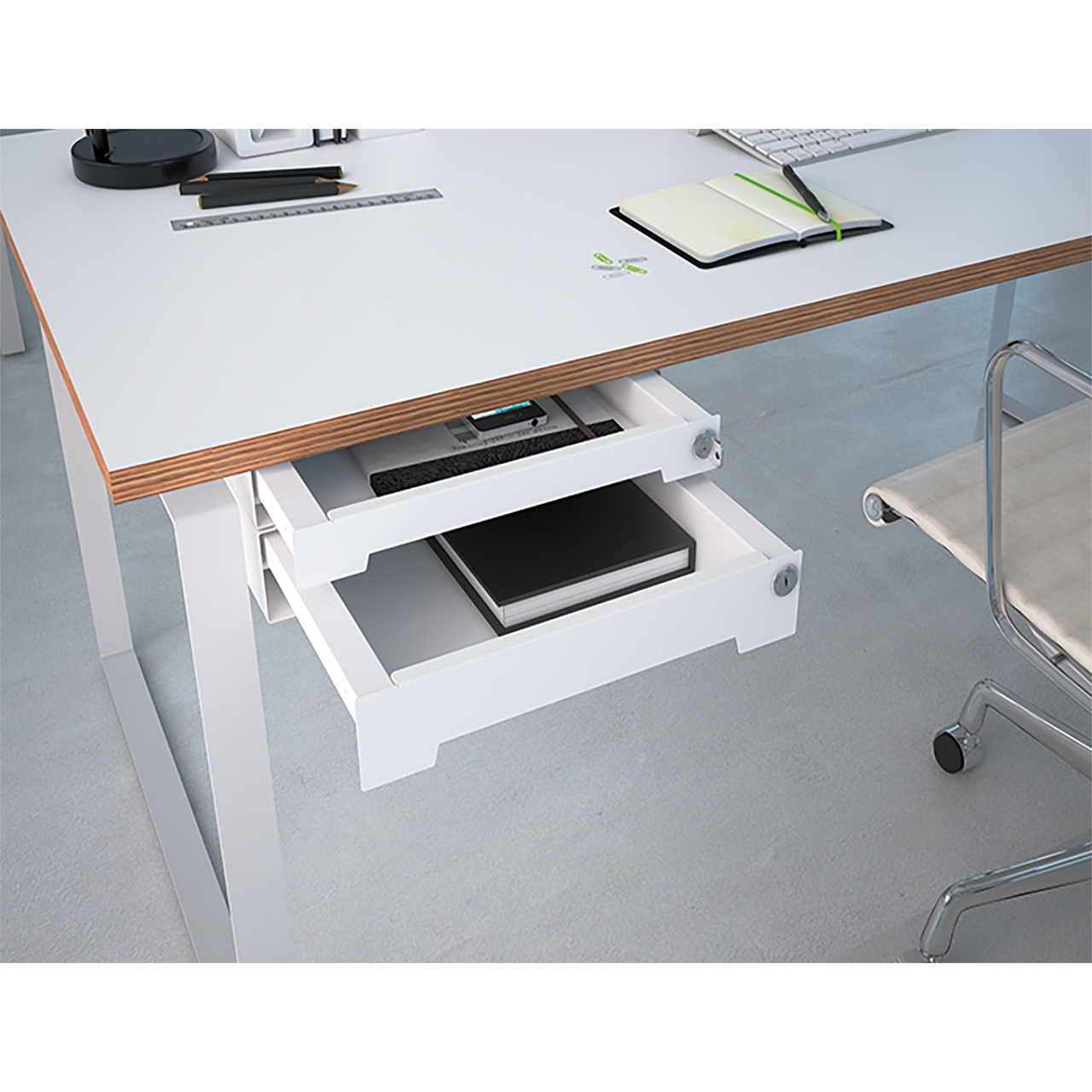 • Schale mit Quadro Vollauszug und Silent System• Montage unter Tischplatte / Oberboden (oder Aufstellung auf Tischplatte / Oberboden)• Abschließbar• Abmessung außen (Breite x Tiefe x Höhe) 379,5 x 235 x 50 mm• Abmessung innen (Breite x Tiefe x Höhe) 310 x 212 x 38 mm• Belastbarkeit 6 kg• Stahl pulverbeschichtetSet besteht aus: • Komplett montierte Schalen mit Kassette• Hebel-Zylinderschlösser ohne Schließzylinder und Schlüssel• Mit eingelegter, geräuschhemmender Filzeinlage in anthrazit• Montagematerial / MontageanleitungHinweise:• Mit dem Verbindungsset ist die Kombination mit einem zweiten SmarTray Stahl mit Kassette oder einer SmarTray Stahl Ablage übereinander möglich• Deckelset für Montage auf Tischplatten / Oberböden separat erhältlich• Lieferzeit 6 Wochen ab Auftragsbestätigung Artikeldaten 2D/3D (DWG/DXF)Hettich CAD Angaben gemäß Produktsicherheitsverordnung ((EU) 2023/998): Hersteller: Hettich Marketing- und Vertriebs GmbH & Co. KG Anton-Hettich-Straße 12-16 32278 Kirchlengern / Germany Telefon: +49 5733 / 798 - 0 eMail: info@hettich.com Web: www.hettich.com