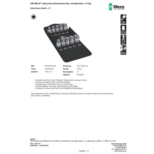 Eigenschaften "Wera 8790 HMC HF 1 Zyklop Steckschlüsseleinsatz-Satz, mit Haltefunktion, 10"