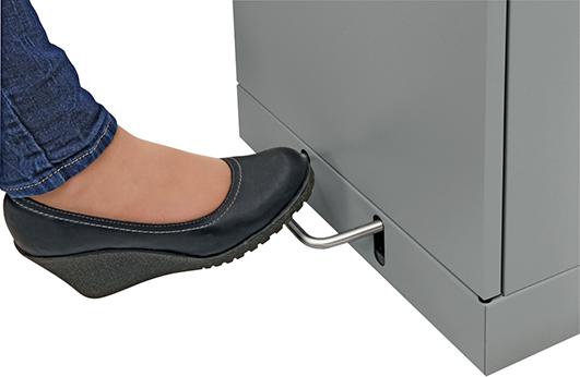Die Einwurfklappe des vielseitigen Abfallsammlers ist wahlweise mit Hand- oder Fußbetätigung lieferbar und verfügt über einen ergonomischer Bogengriff und Trethebel aus Edelstahl.