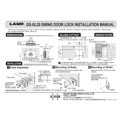Eigenschaften "Sugatsune GS-GL20-BL-D Hebelschloss, für Glastüren, Serie Million Lock, gleichschließend, Schwarz"