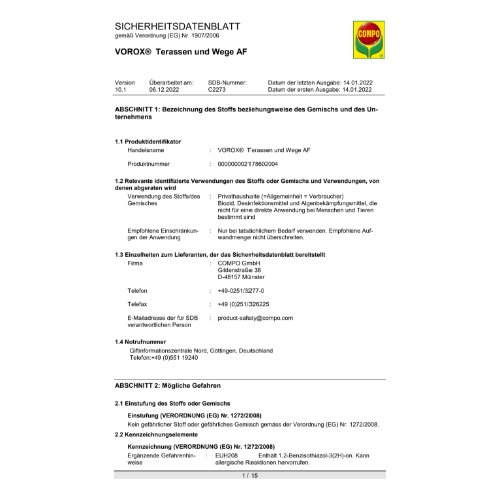Schütteln Sie VOROX Terrassen und Wege vor dem gebrauch und verdünnen es entsprechend der  Dosierungsangaben mit Wasser. Durch einfaches Aufsprühen wird hartnäckiger Grünbelag auf  Steinen, Holz und Natursteinen zuverlässig beseitigt.