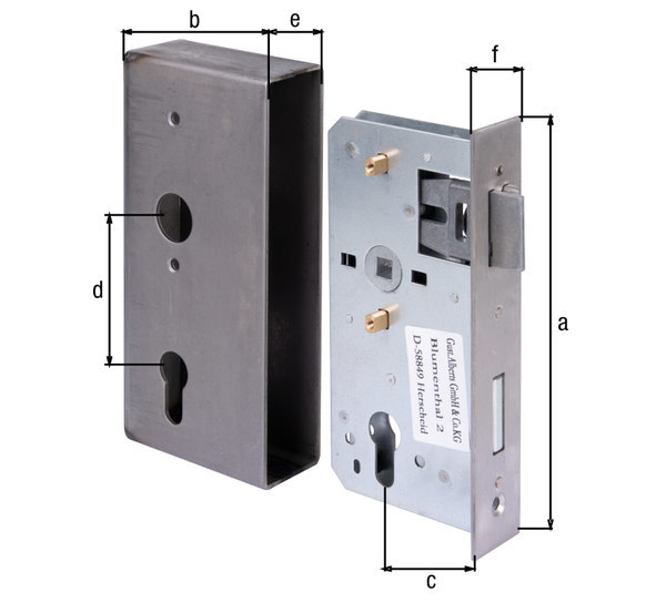 | Variante: | Gustav Alberts Tor-Schlosskasten, m.verz.Schloss, Profilzylinder gelocht,D55,E72,VK8, 40 kantig |