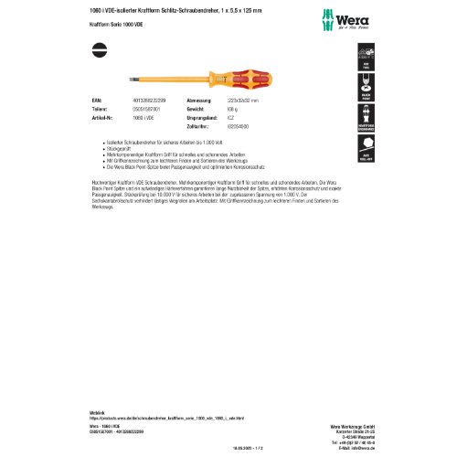 Produktinformationen "Wera 1060 i VDE-isolierter Kraftform Schlitz-Schraubendreher, 1 x 5,5 x 125"