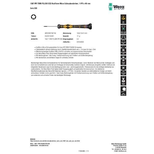 Wera 1567 IPR TORX PLUS ESD Kraftform Micro Schraubendreher, 1 IPR x 40 mm