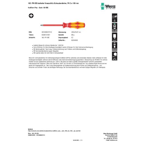 Variante: | Wera 162 i PH VDE-isolierter Kreuzschlitz-Schraubendreher, PH 2 x 100 mm |