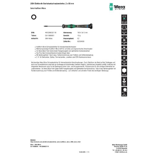 05118068001Angaben gemäß Produktsicherheitsverordnung ((EU) 2023/998): Hersteller: Wera Werkzeuge GmbH, Korzerter Straße 21-25, D- 42349 Wuppertal Tel.: +49 (0)202/4045 - 0