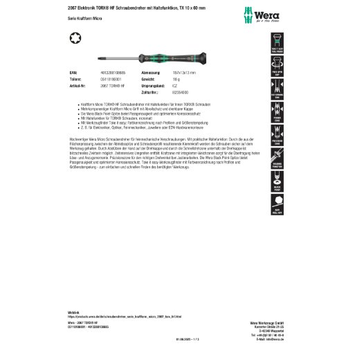 Variante: | Wera 2067 Elektronik TORX HF Schraubendreher mit Haltefunktion, TX 10 x 60 |