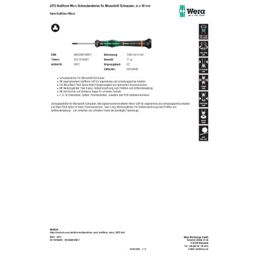 Produktinformationen "Wera 2072 Kraftform Micro Schraubendreher für Microstix Schrauben, m x 40 m"