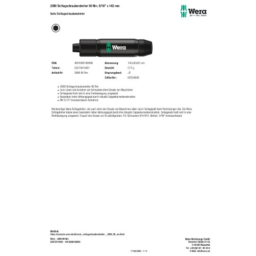 Produktinformationen "Wera 2090 Schlagschraubendreher 90 Nm, 5/16" x 142 mm"