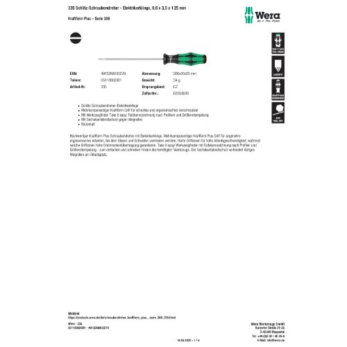 slotted, Kraftform, Rundklinge, 335, Schlitz-Schraubenzieher, torque, Wera, Elektrikerklinge, Schlitz-Schraubendreher, lasertip, screwdriver, transfer, Weichzonen, Lasertip, Abrollschutz, Schraubenzieher, Schlitz, Schraubendreher, 540750, 4013288181244, 05100044001, 335 SB Schlitz-Schraubendreher - Elektrikerklinge, 1 x 5,5 x 125 mm