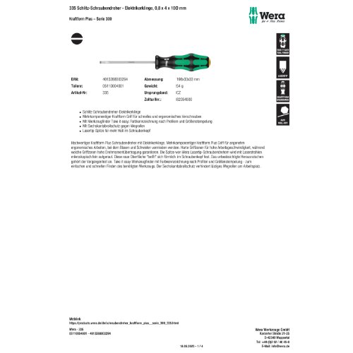 slotted, Kraftform, Rundklinge, 335, Schlitz-Schraubenzieher, torque, Wera, Elektrikerklinge, Schlitz-Schraubendreher, lasertip, screwdriver, transfer, Weichzonen, Lasertip, Abrollschutz, Schraubenzieher, Schlitz, Schraubendreher, 540748, 05100042001, 4013288181275, 335 SB Schlitz-Schraubendreher - Elektrikerklinge, 0,6 x 3,5 x 100 mm
