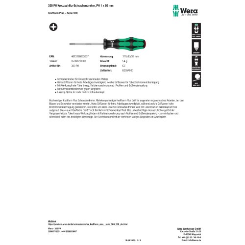 Phillips, Kraftform, Rundklinge, Wera, PH, lasertip, screwdriver, 350, Weichzonen, Lasertip, Abrollschutz, Schraubenzieher, Kreuzschlitz, Schraubendreher, 05100050001, phillips, 4013288181329, torque, 350 PH SB Kreuzschlitz-Schraubendreher, PH 0 x 60 mm, 540751, transfer
