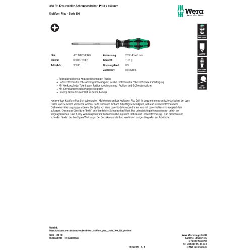 Phillips, Kraftform, Wera, PH, lasertip, screwdriver, 350, Weichzonen, Lasertip, Abrollschutz, Schraubenzieher, Kreuzschlitz, Schraubendreher, phillips, torque, transfer, Sechkantklinge, 326482, 350 SK PH Kreuzschlitz-Schraubendreher, PH 3 x 150 mm, 05008753001, 4013288108159