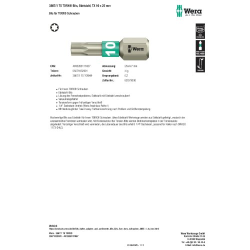 Variante: | Wera 3867/1 TS TORX Bits, Edelstahl, TX 10 x 25 mm |