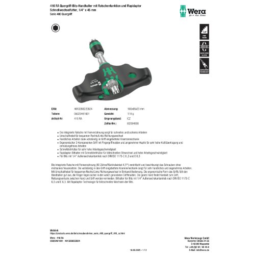 Eigenschaften "Wera 416 RA Quergriff-Bits-Handhalter mit Ratschenfunktion und Rapidaptor S"