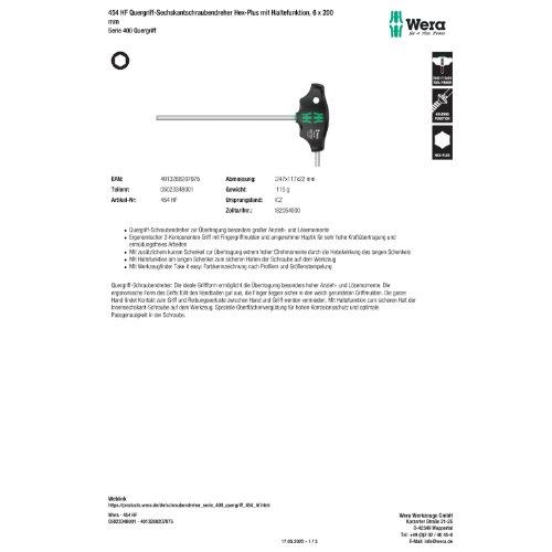 Eigenschaften "Wera 454 HF Quergriff-Sechskantschraubendreher Hex-Plus mit Haltefunktion, 6 x 200 mm"