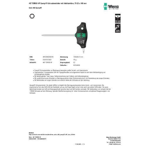 Eigenschaften "Wera 467 TORX HF Quergriff-Schraubendreher mit Haltefunktion, TX 20 x 100 m"