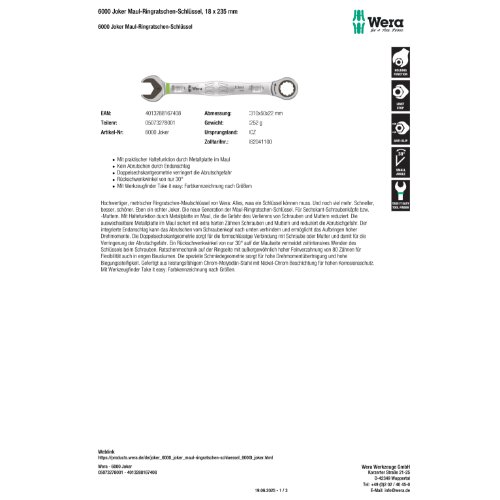 Produktinformationen "Wera 6000 Joker Maul-Ringratschen-Schlüssel, 18 x 235 mm"