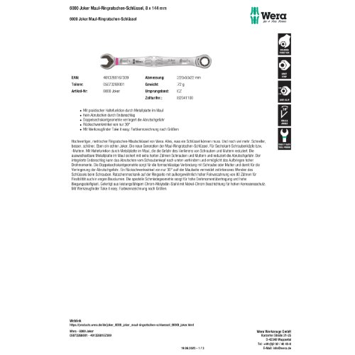 Produktinformationen "Wera 6000 Joker Maul-Ringratschen-Schlüssel, 8 x 144 mm"