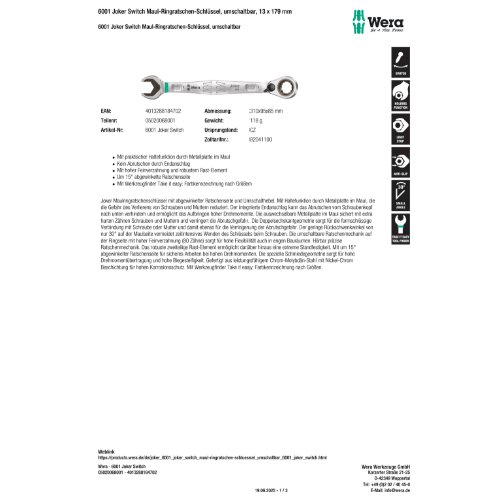 Produktinformationen "Wera 6001 Joker Switch Maul-Ringratschen-Schlüssel, umschaltbar, 13 x 179 m"