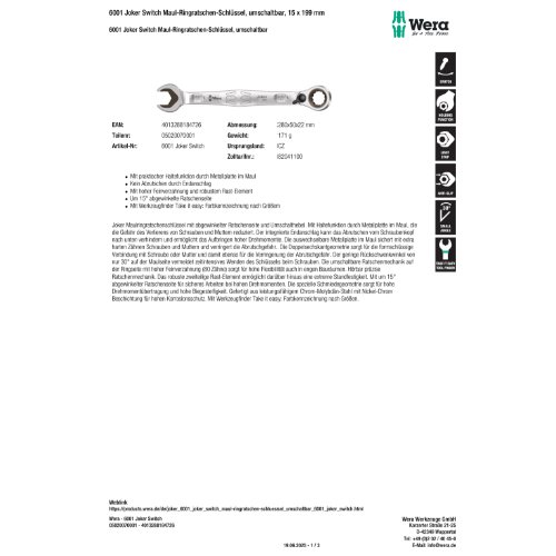 Variante: | Wera 6001 Joker Switch Maul-Ringratschen-Schlüssel, umschaltbar, 15 x 199 m |