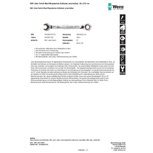 Variante: | Wera 6001 Joker Switch Maul-Ringratschen-Schlüssel, umschaltbar, 16 x 213 m |