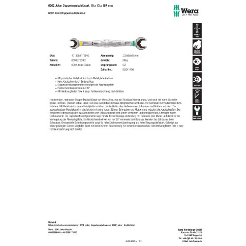 05003760001, 258550, 4013288173010, 6002 Joker Doppelmaulschlüssel, 10 x 13 x 167 mm, Doppel-Maulschlüssel, Doppelmaul-Schlüssel, Doppelmaulschlüssel, double, Gabelschlüssel, Handwerkzeug, joker, Maul-Schlüssel, Maulschlüssel, open, Schlüssel, Schraubenschlüssel, Schraubwerkzeug, spanner, Wera, Werkzeug, wrench