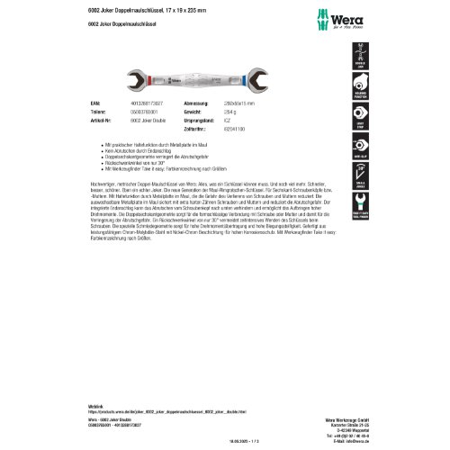 Produktinformationen "Wera 6002 Joker Doppelmaulschlüssel, 17 x 19 x 235 mm"