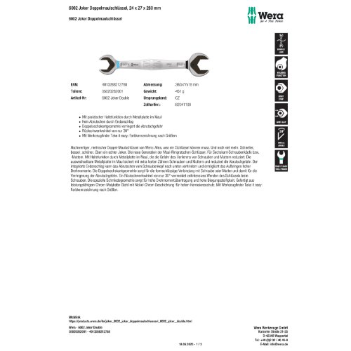 Variante: | Wera 6002 Joker Doppelmaulschlüssel, 24 x 27 x 280 mm |