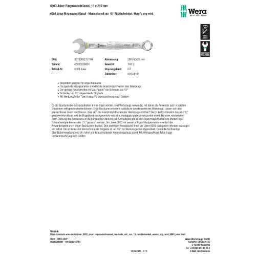 Produktinformationen "Wera 6003 Joker Ringmaulschlüssel, 18 x 210 mm"
