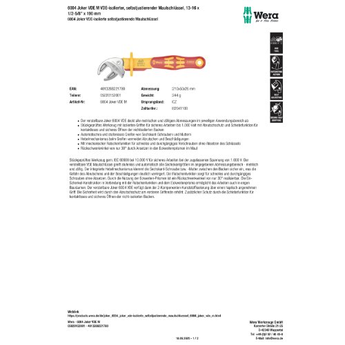 Variante: | Wera 6004 Joker VDE M VDE-isolierter, selbstjustierender Maulschlüssel, 13- |