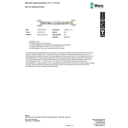 Variante: | Wera 6005 Joker Doppelmaulschlüssel, 10 x 11 x 137,3 mm |