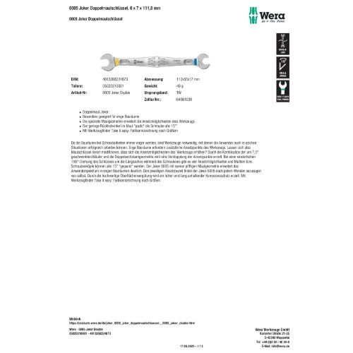 Variante: | Wera 6005 Joker Doppelmaulschlüssel, 6 x 7 x 111,8 mm |