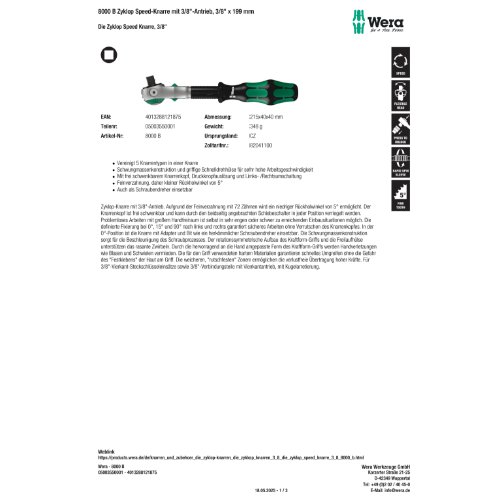Variante: | Wera 8000 B Zyklop Speed-Knarre mit 3/8"-Antrieb, 3/8" x 199 mm |