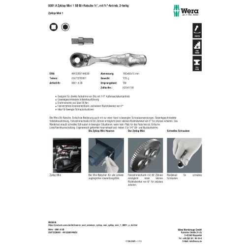 Wera, ratschenschrauber, umschaltknarre, 05073230001, bit-ratsche, Ratchet-set, 213034, 8001 A Zyklop Mini 1 SB Bit-Ratsche ¼", mit ¼"-Antrieb, 2-te, 4013288144638