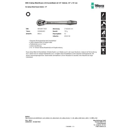 05004003001<br /><br /><b>Angaben gemäß Produktsicherheitsverordnung ((EU) 2023/998):</b><br />Hersteller: Wera Werkzeuge GmbH, Korzerter Straße 21-25, D- 42349 Wuppertal<br />Tel.: +49 (0)202/4045 - 0