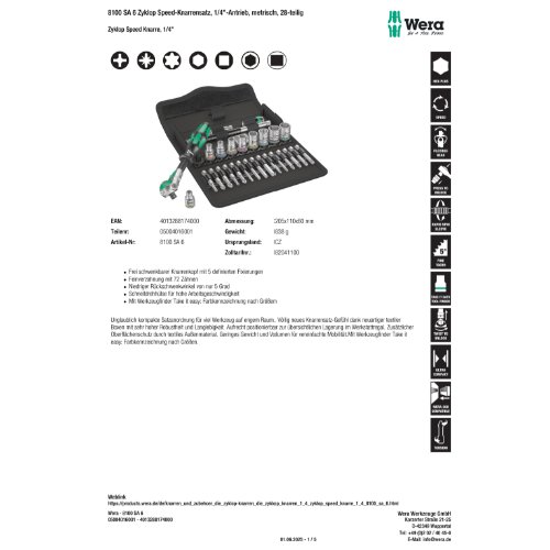 Variante: | Wera 8100 SA 6 Zyklop Speed-Knarrensatz, 1/4"-Antrieb, metrisch, 28-te |