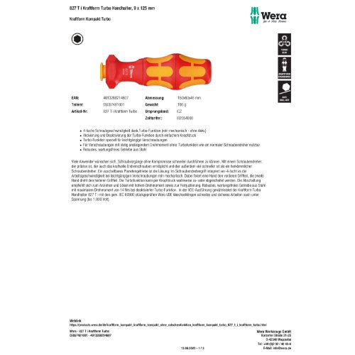 Produktinformationen "Wera 827 T i Kraftform Turbo Handhalter, 9 x 125 mm"
