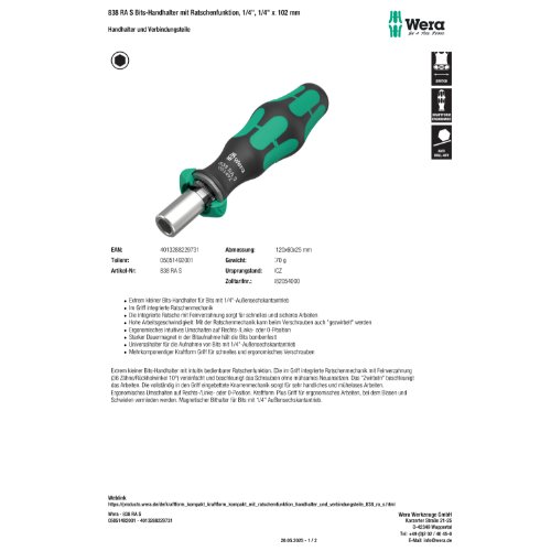 Produktinformationen "Wera 838 RA S Bits-Handhalter mit Ratschenfunktion, 1/4", 1/4" x"