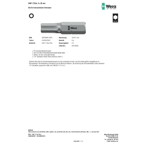 05056303001, 1/4", 250438, 4013288012623, 840/1 Z Bits, 1,5 x 25 mm, bit, Bit, bits, bosch, fein, hex, Hex, Hex-Plus, holz-her, lecreux, metabo, Schraubendrehereinsatz, Sechskant, universal, universal, Wera, zähhart
