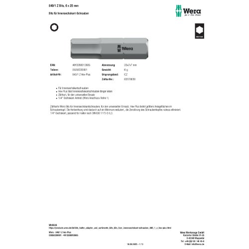 05073055001, 1/4", 4013288202543, 540465, 840/1 Z Bits SB, 6 x 25 mm, 2-teilig, bit, Bit, bits, bosch, fein, hex, Hex, Hex-Plus, holz-her, lecreux, metabo, Schraubendrehereinsatz, Sechskant, universal, universal, Wera, zähhart