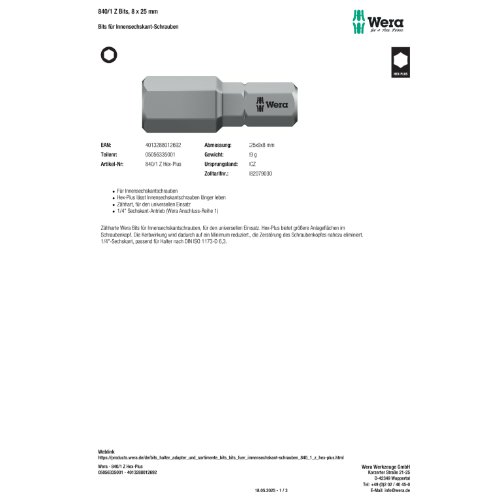 05056340001, 1/4", 258644, 4013288012708, 840/1 Z Bits, 10 x 25 mm, bit, Bit, bits, bosch, fein, hex, Hex, Hex-Plus, holz-her, lecreux, metabo, Schraubendrehereinsatz, Sechskant, universal, universal, Wera, zähhart