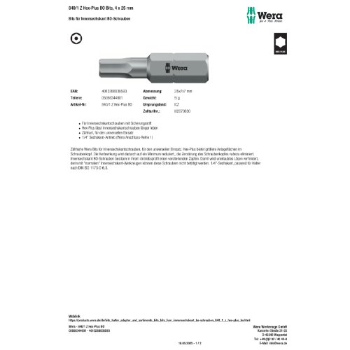 Variante: | Wera 840/1 Z Hex-Plus BO Bits, 4 x 25 mm |