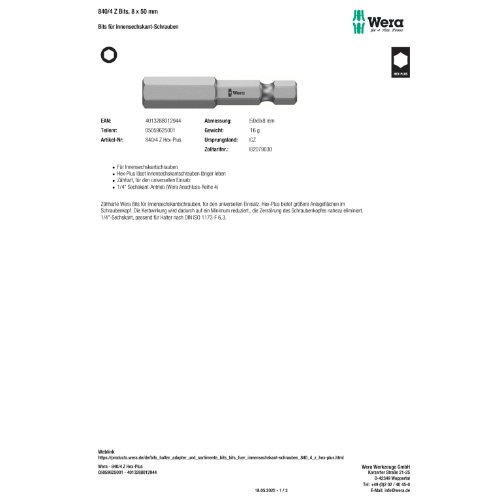 Eigenschaften "Wera 840/4 Z Bits, 8 x 50 mm"
