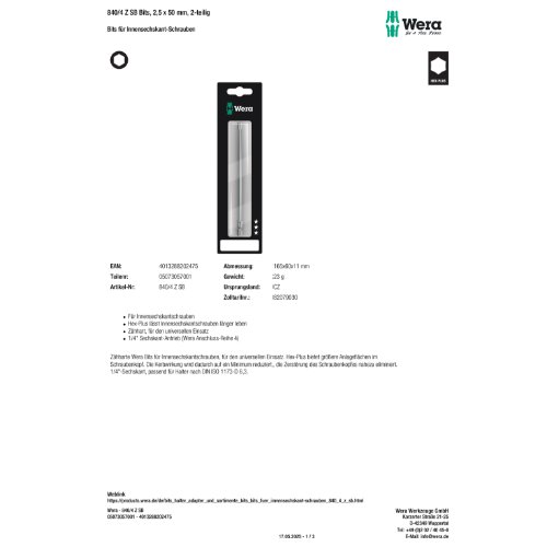 Eigenschaften "Wera 840/4 Z SB Bits, 2,5 x 50 mm, 2-teilig"