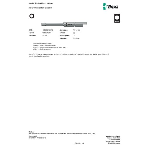 Variante: | Wera 840/9 C Bits Hex-Plus, 2 x 44 mm |