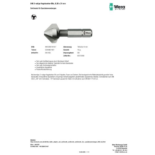 | Variante: | Wera 846 3-nutige Kegelsenker-Bits, 8,30 x 31 mm |