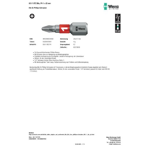 Hülse, coded, Phillips, quick, rot, bit, set, Schraubendrehereinsatz, check, phillips, Bit, Wera, checks, PH, Sechskant, color, zähhart, release, bi-torsion, colour, universal, Farbkennzeichung, Bitorsion, holder, Kreuzschlitz, Größenstempel-, 1/4", 343681, 851/1 BTZ Bits, PH 1 x 25 mm, 4013288034458, 05056420001