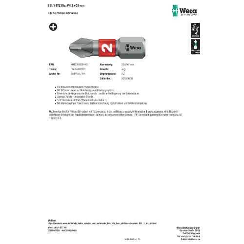 Hülse, coded, Phillips, quick, rot, bit, set, Schraubendrehereinsatz, check, phillips, Bit, Wera, checks, PH, Sechskant, color, zähhart, release, bi-torsion, colour, universal, Farbkennzeichung, Bitorsion, holder, Kreuzschlitz, Größenstempel-, 1/4", 343681, 851/1 BTZ Bits, PH 1 x 25 mm, 4013288034458, 05056420001