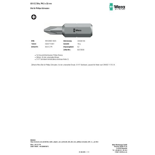 05057710001, 1/4", 4013288013675, 442217, 851/2 Z Bits, PH 2 x 32 mm, bit, Bit, bits, bosch, fein, holz-her, Kreuzschlitz, lecreux, metabo, PH, phillips, Phillips, Schraubendrehereinsatz, Sechskant, universal, Wera, zähhart